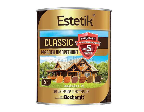 Импрегнант на маслена основа - Бохемит Естетик е предназначен за обработка на дървени повърхности за външна и вътрешна употреба, за промишлено производство или за занаятчийски дейности. Продуктът предпазва дървесината от проникване на вода. Попива дълбоко в дървесната тъкан и подчертава структурата ?. С добавени масла за предпазване от влиянието на тежките атмосферни условия, покритието не се люспи, UV филтри. Има много добра покривност която варира около 7-12м2 за един слой в зависимост от дървесината.