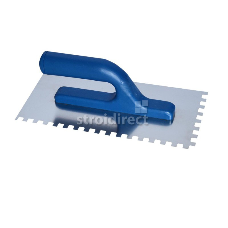 Назъбена мистрия от неръждаема стомана с размери 270мм х 130 мм и пластмасова дръжка. Подходяща е за нанасяне на варов разтвор - хоросан и лепила.