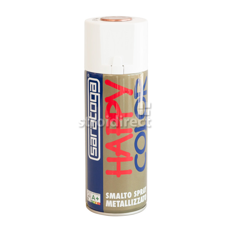 Спрей боята на HAPPY COLOR SARATOGA е бързосъхнеща алкидна боя в цвят металик мед. Намира приложение на открито и закрито, като изсъхва на пипане за 15 минути, а за пълното изсъхване са нужни до 45 минути.