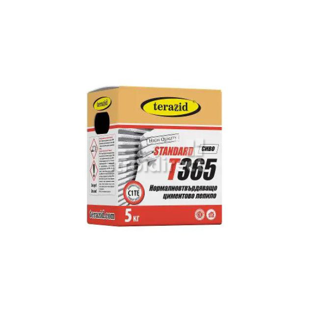Теразид STANDARD T365 е сух продукт на база цимент за приготвяне на лепилен разтвор за полагане на фаянс и теракота с гладка или профилирана обратна страна. За вътрешно приложение. С вложени фибри, които армират и придават допълнителна якост.